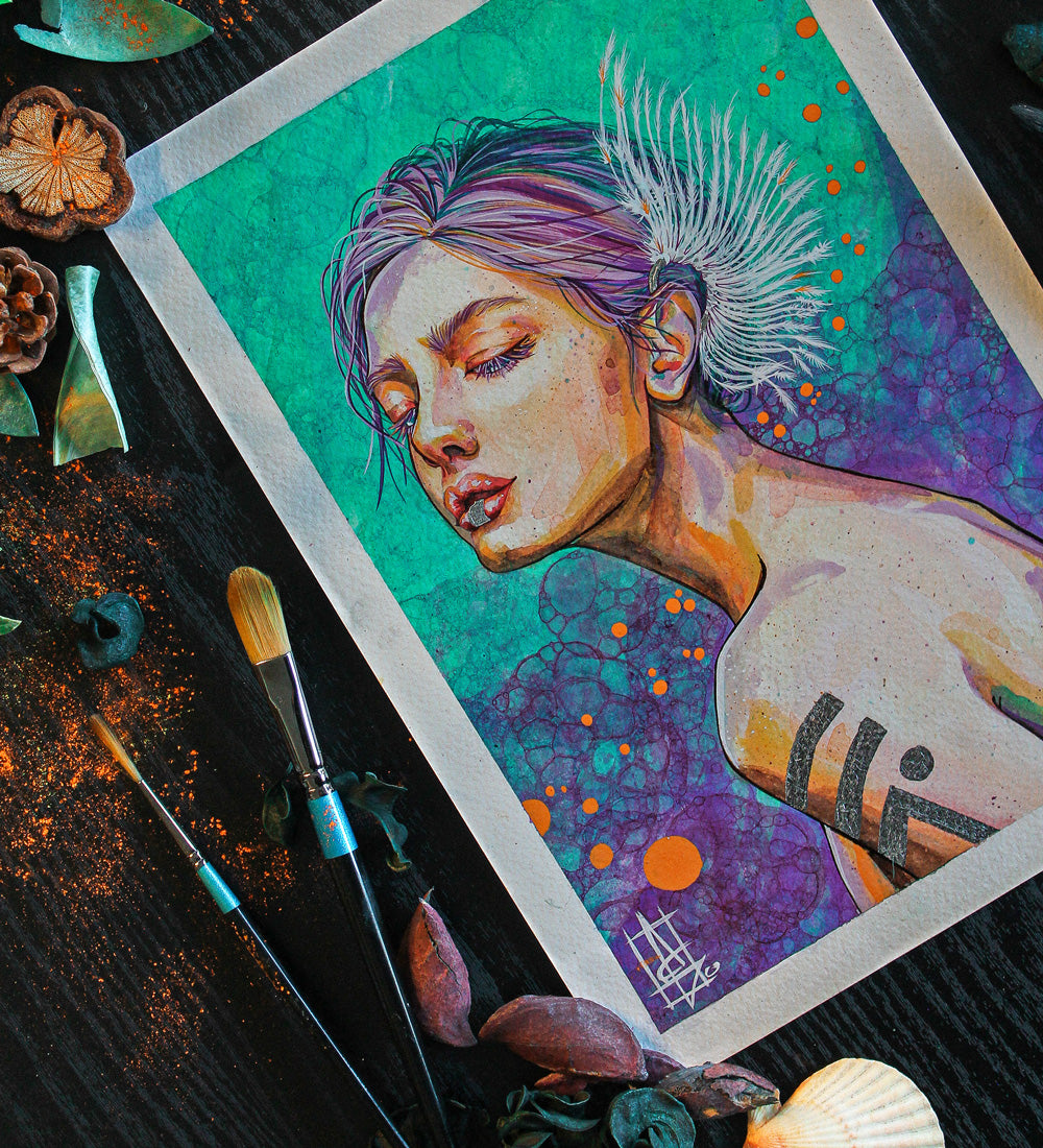 As an artist, I find inspiration in the changing of the seasons and the way nature transforms itself in breathtaking ways. This artwork is titled "The Salamander Queen" and aims to capture the essence of transformation and adaptability, drawing on the alchemical symbolism of the salamander as a creature of purification and rebirth.