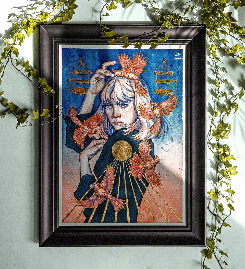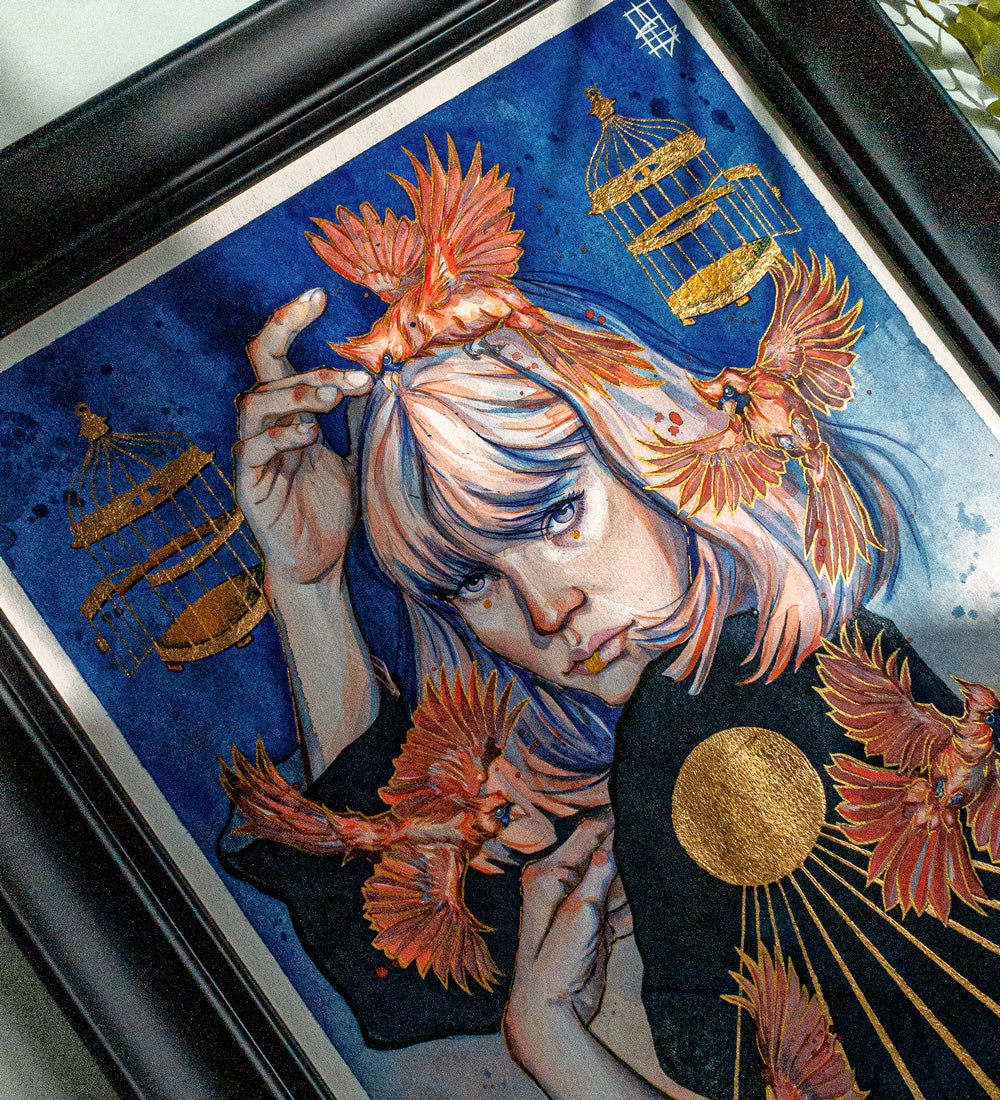 During the creative process, I realized that the paradox of the absurd is that we hold the power to make choices, yet these choices often come with unforeseen consequences that can feel like a trap. It's like the alluring golden cages that promise us beauty and comfort but ultimately bind us in a prison of our own making. But let us not forget that we possess the ability to break free. To do so, we must take risks and make sacrifices to embrace our inner strength and let it guide us towards our true purpose in life.
