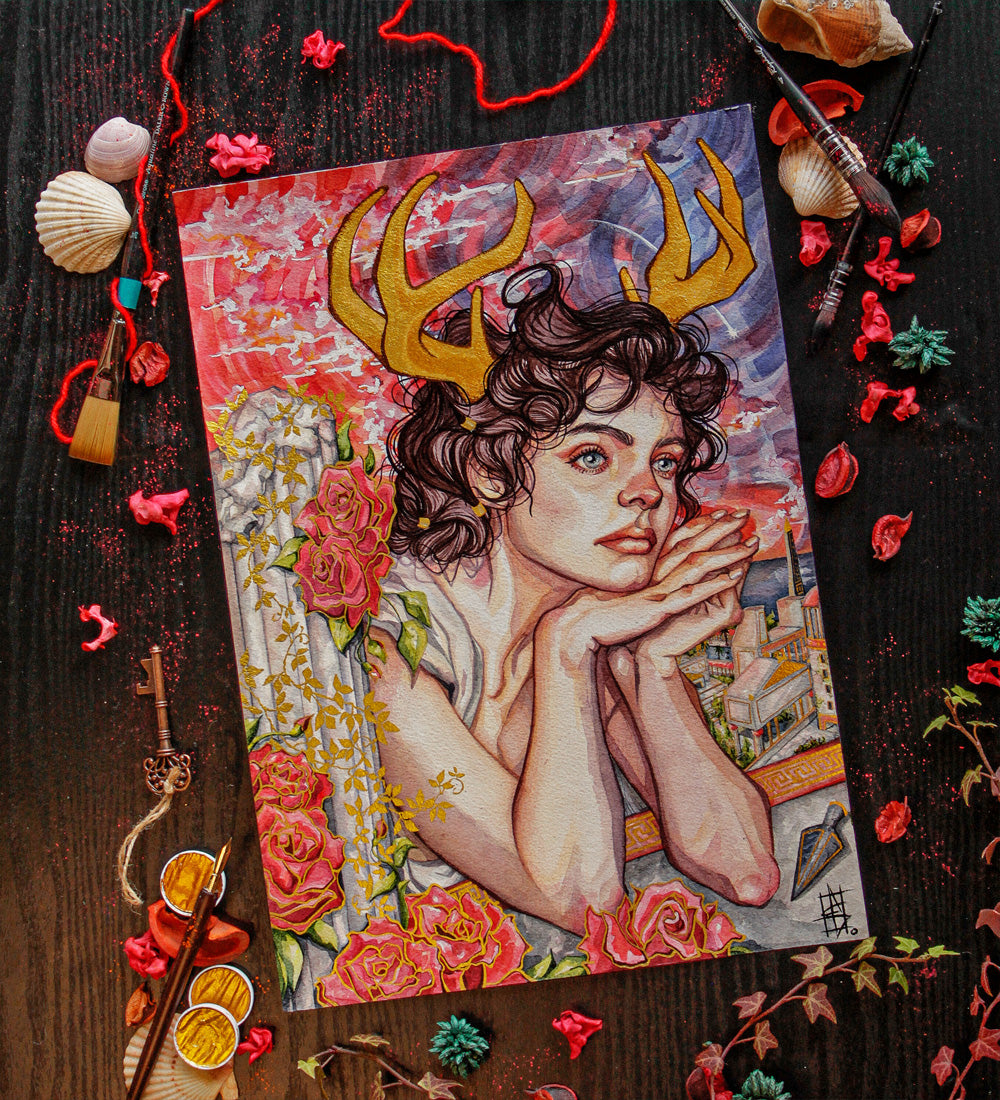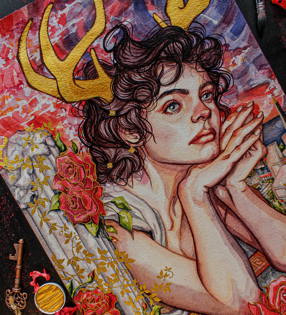 Taygete's bravery and gratitude have been immortalized in the night sky, shining bright for all to see. The golden city in the background of the painting is a tribute to the ingenuity and creativity of ancient civilizations, and a reminder of the great potential that we all have within us. The arrowhead pointing down to earth serves as a warning of the fragility of our world and the need to protect it. This painting is a celebration of the resilience and immortality of the human spirit, and an invitation to explore the mysteries of our shared history.